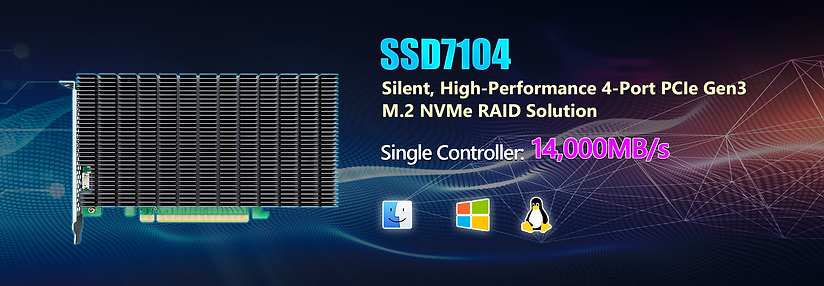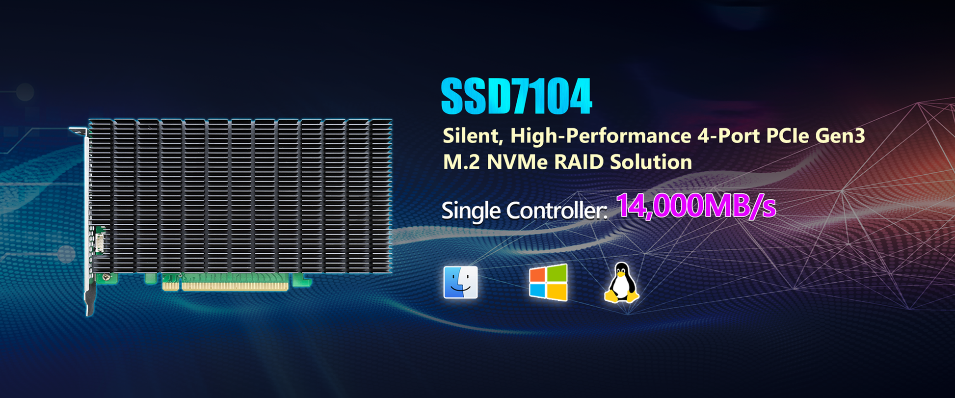 The HighPoint SSD7104 PCIe RAID controller provides high-speed connectivity for up to four M.2 NVMe SSDs via a PCIe 3.0 x16 interface, maximizing bandwidth and throughput. Compatible with Windows, Linux, and macOS, and supporting RAID levels 0, 1, 10, and single drive mode, it offers flexible deployment options. RAID setup and management are accessible through intuitive tools including WebGUI, CLI, BIOS, and UEFI. This full-height card, with compact dimensions, is ideal for professional environments where performance and reliability are critical.