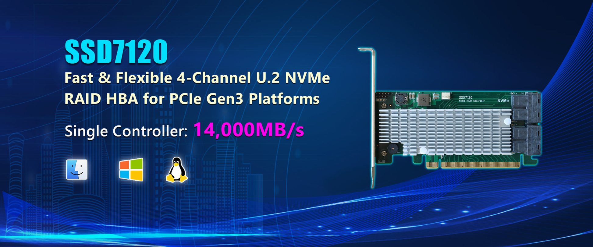 This low-profile RAID card supports RAID levels 0, 1, 10, and Single, and is compatible with Windows, Linux, and macOS. Management is streamlined via WebGUI, CLI, BIOS, and UEFI interfaces. Compact dimensions make it ideal for tight chassis environments, and while it's not TAA-compliant, it’s well-suited for commercial deployments. For compact, high-performance NVMe RAID capabilities, the SSD7120 delivers performance and flexibility.