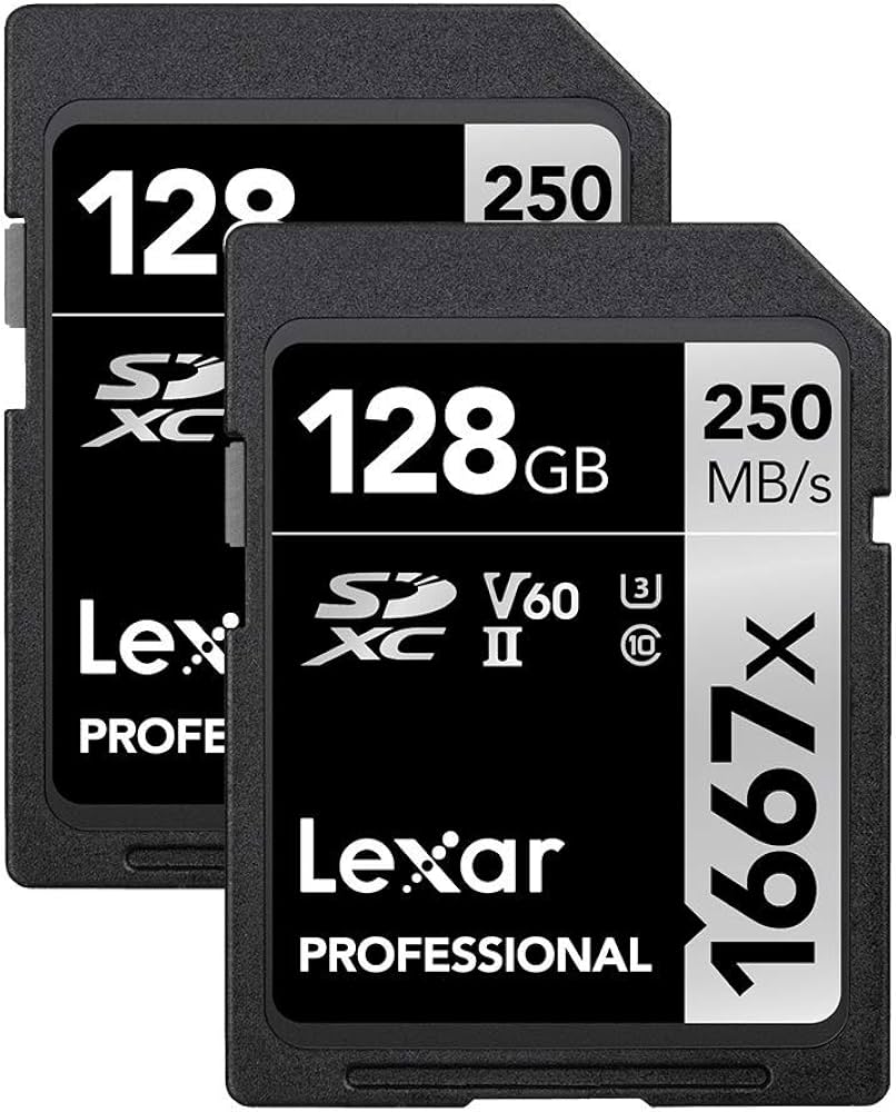 • 128GB SDXC UHS-II memory cards (2-pack format) for high-capacity storage