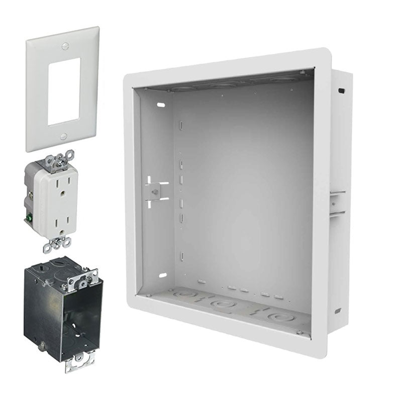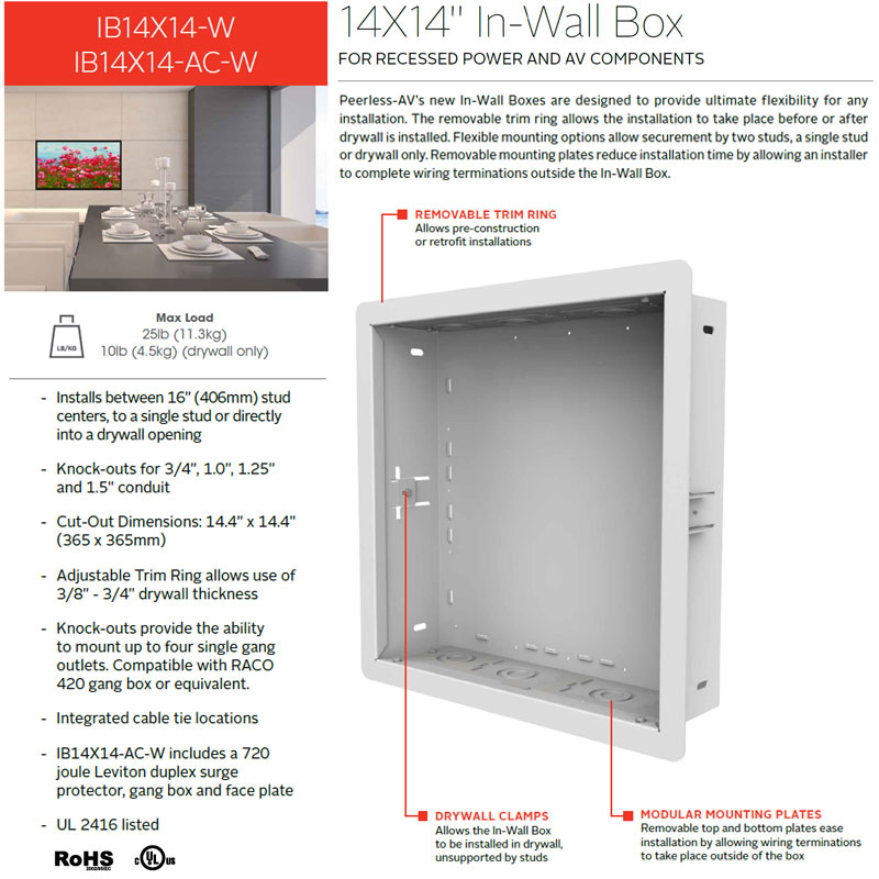 14X14 In-Wall Box for Recessed Power and AV Components - The removable trim ring allows the installation to take place before or after drywall is installed.