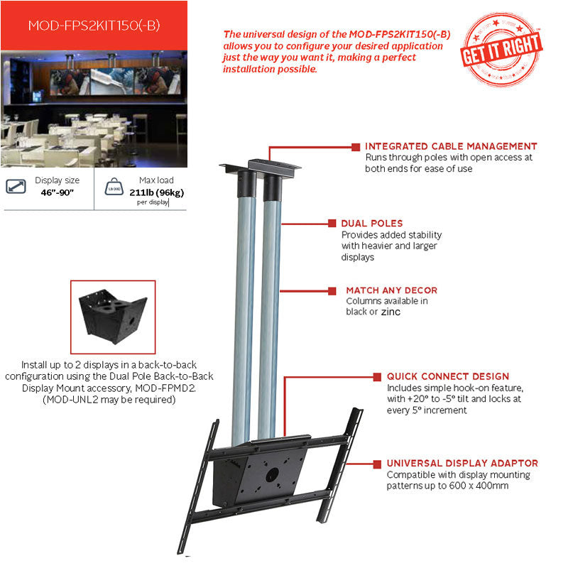 Modular Series Dual-Pole Back-to-Back Display Mount for 46IN to 90IN Displays, Black - Limited 5-yearSpecifications