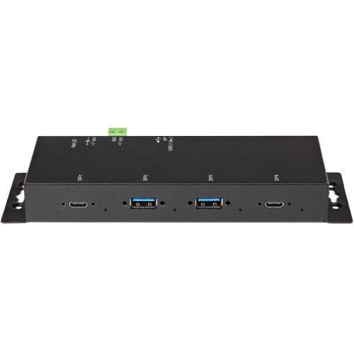 Industrial metal 4-Port USB-C hub SuperSpeed 10Gbps USB 3.1 Gen 2 - 2x USB-A, 2x USB-C - Mountable USB Type-C hub - ESD Surge protection 15kV Air/8kV Contact - Self-Powered up to 30W shared/7-24V terminal - Screw-lock USB-C and USB-A host cables incl