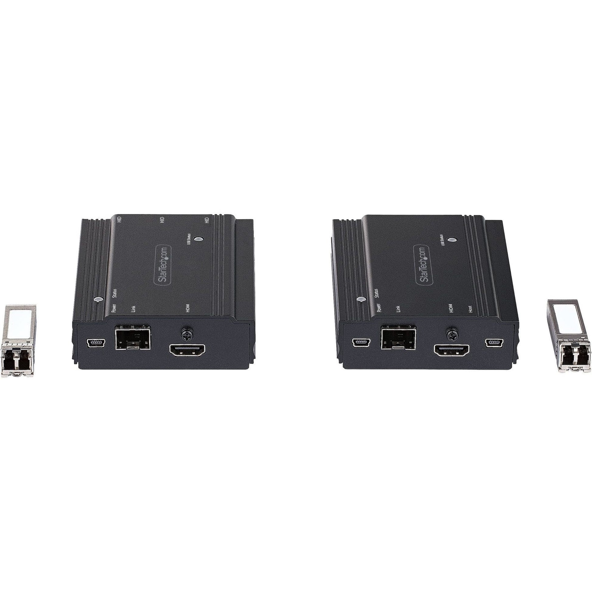 HDMI and USB KVM extender kit controls a KVM switch/console or PC using fiber optic cable up to 984ft (multimode) or 1640ft (single mode) - 4K 60Hz UHD/3x USB 2.0 HID/EDID Passthrough/HDCP 2.2/Digital 7.1 Audio/Open SFP+ Slots/2x 10G MM SFP+/LC
