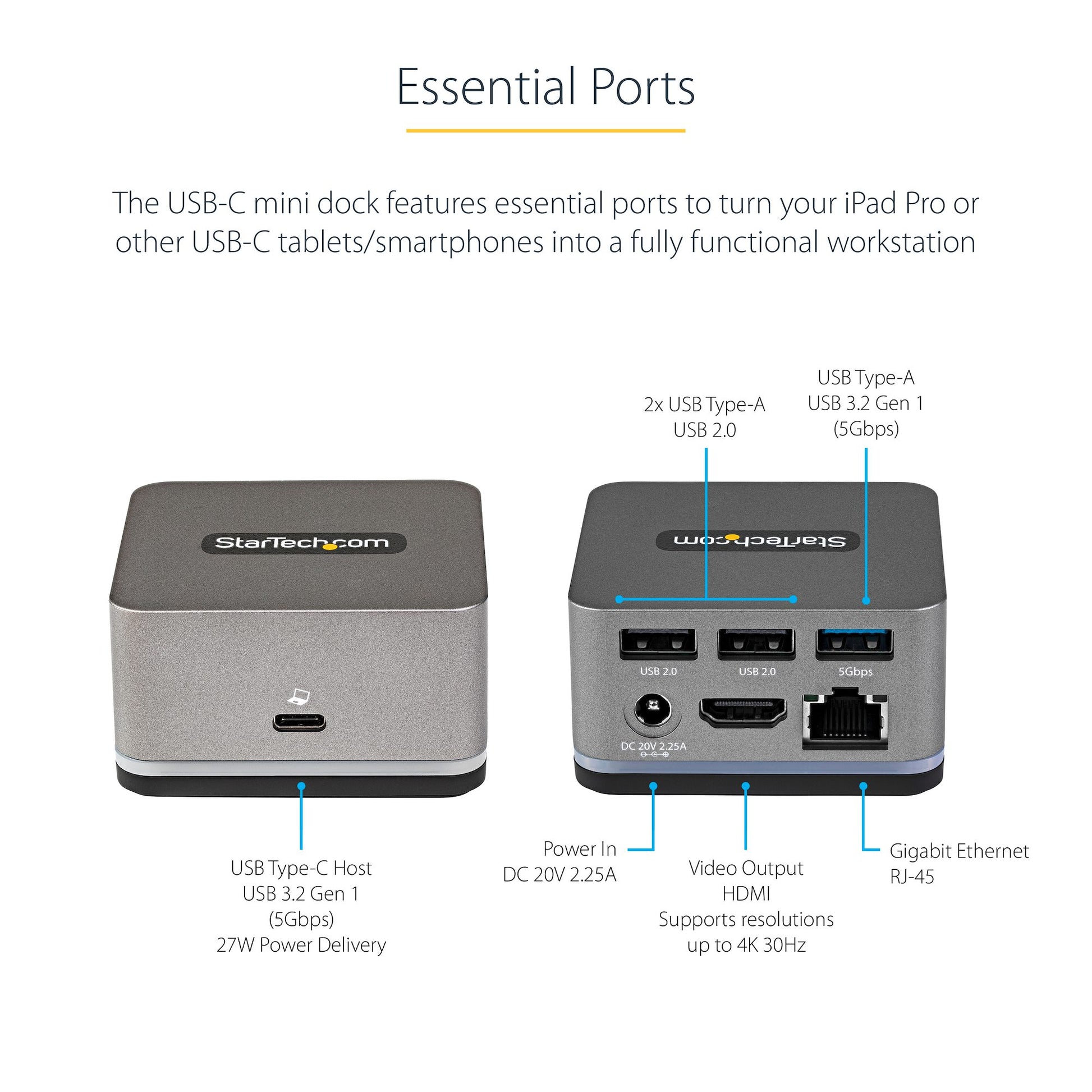 Ultra compact USB-C mini docking station for iPad Pro/USB-C tablets/smartphones - 3.3ft detached USB-C cable - HDMI 4K 30Hz/1x USB-A 5Gbps/2x USB-A 2.0/GbE - Incl 45W power adapter w/ 27W for Power Delivery charging - Chrome OS/iPadOS/Android 9.0