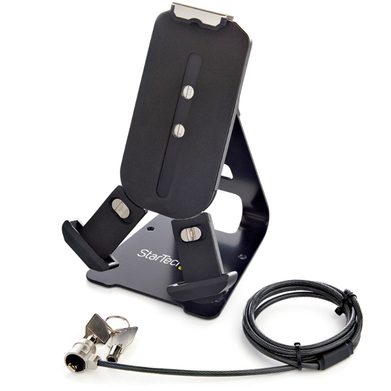 Universal Secure Tablet Stand for 7.9-13 inch devices up to 0.37in thick and 1.5lb - Adjustable tablet holder; Tilt/Rotate - Secure to desk (screws incl); 2x K-slots; 1x 6ft K-slot keyed lock - Security locking tablet mount ideal for iPad/Galaxy TabSpecifications