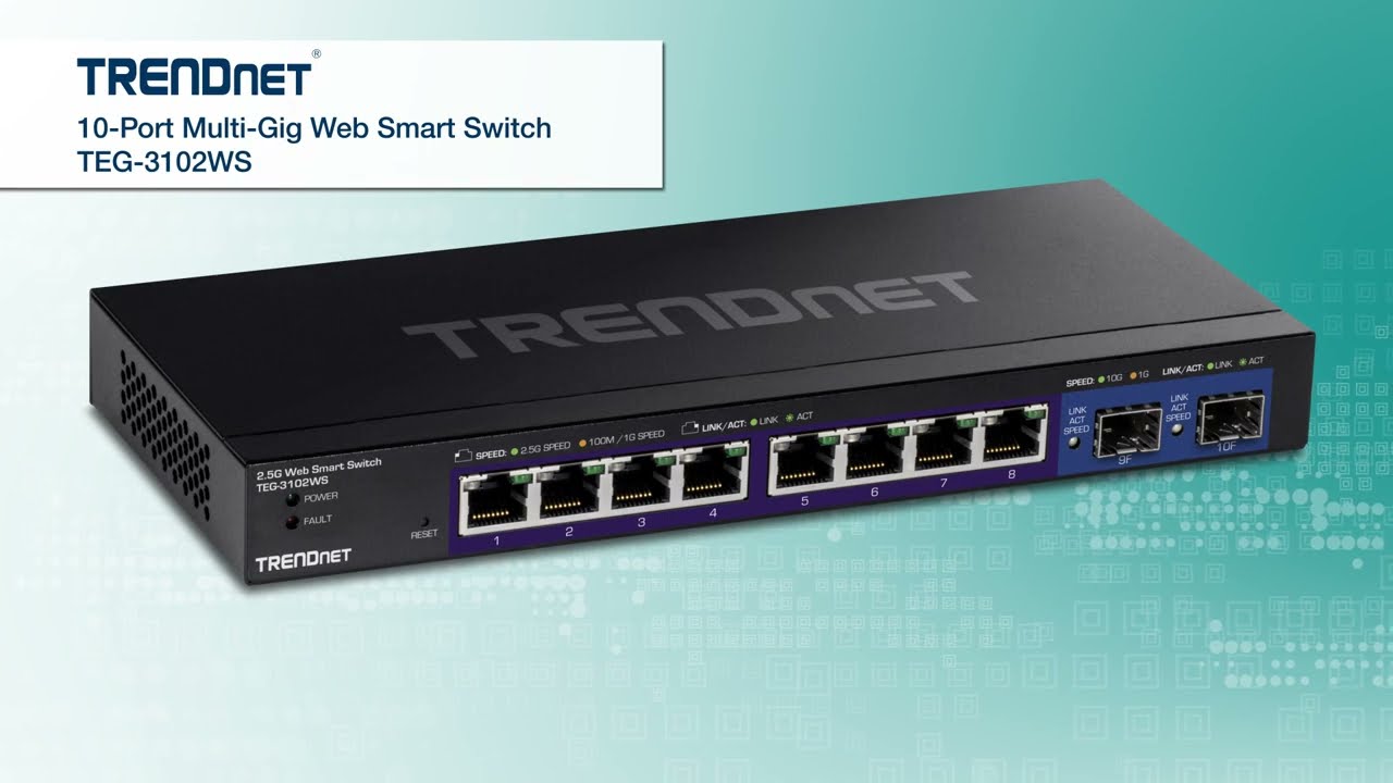 The TRENDnet TEG-3102WS is a high-performance 10-port 2.5G Web Smart Switch with eight 2.5G ports and two 10G SFP+ slots, offering robust connectivity and 20 Gbps switching capacity. Designed for professional networks, it supports backward compatibility with legacy Ethernet standards and is TAA compliant for government use. With a compact form factor, energy-efficient power design, and lifetime warranty, this switch is built for reliable long-term deployment.
