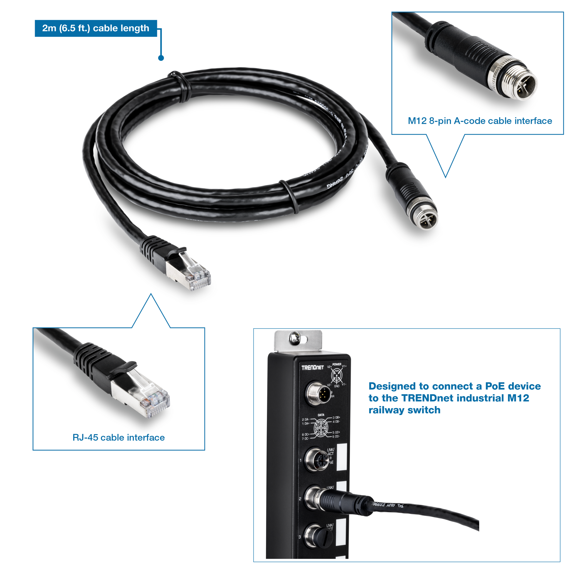 • Connects M12 and RJ-45 interfaces for industrial networking
