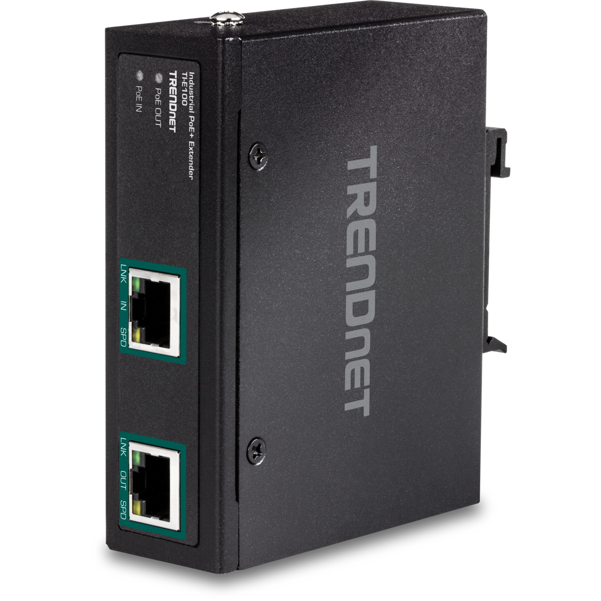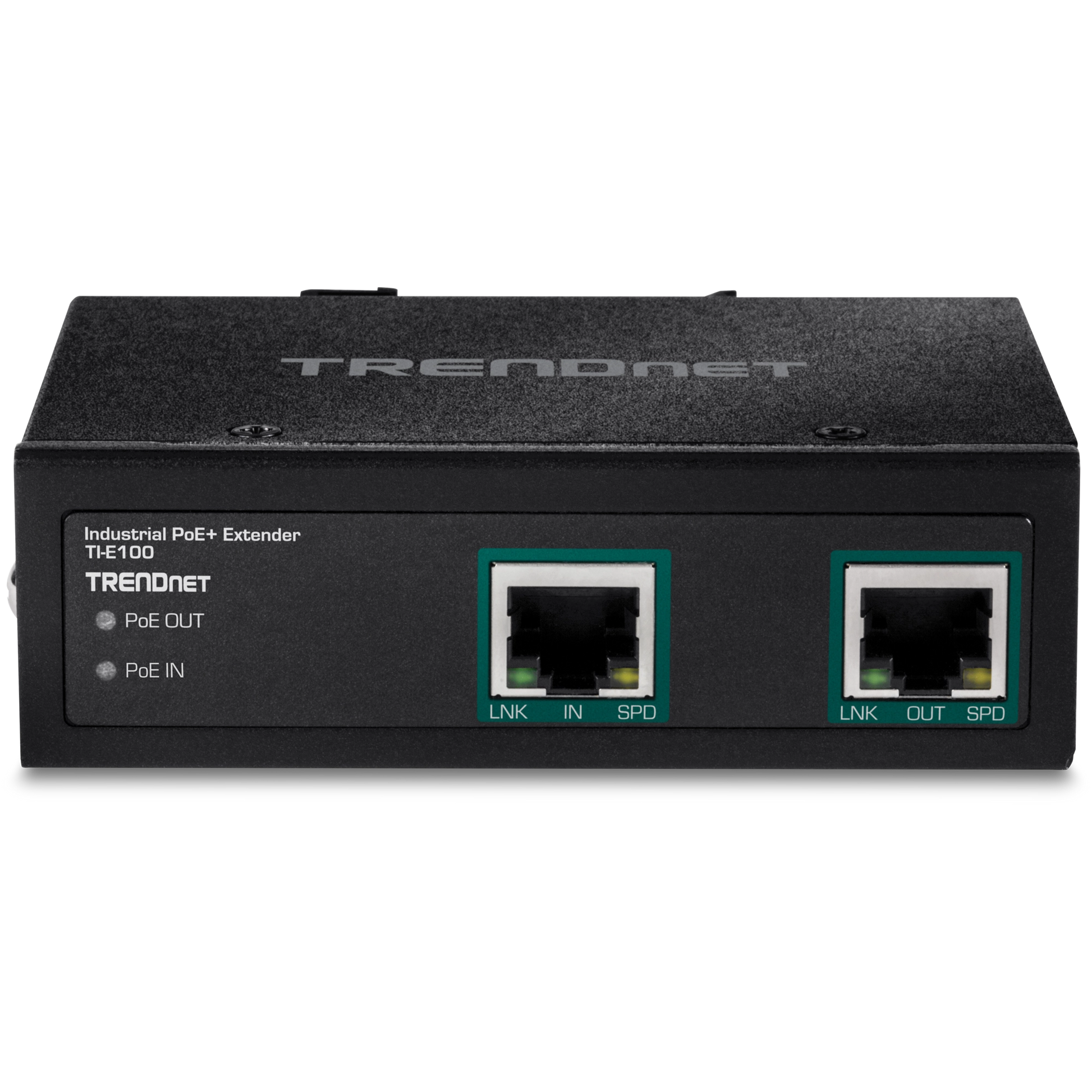 Industrial Gigabit PoE+ Extender, model TI-E100, takes a single PoE+ connection and extends it an additional 100m (328 ft.) for remote PoE/PoE+ device installation.Specifications