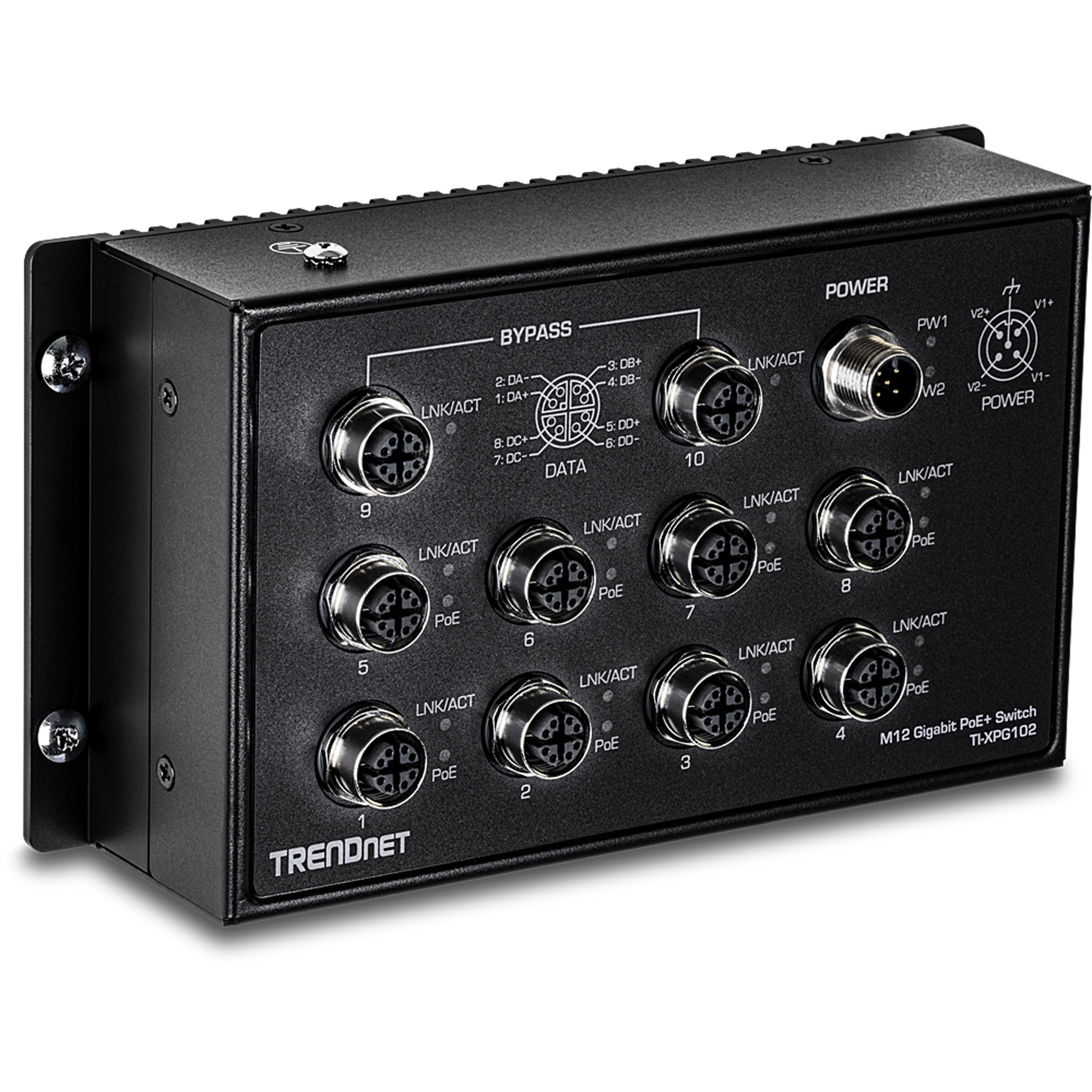 The TRENDNET TI-XPG50 is a 5-Port Industrial Ethernet Switch designed for reliable use in vibration-prone and physically demanding environments. Certified to EN50155 standards, it is built with secure M12 connectors to withstand motion and shock during transport or on factory floors. Supporting TAA compliance and built in Taiwan, the switch combines industrial-grade resilience with dependable connectivity, making it a versatile choice for mission-critical networking deployments.