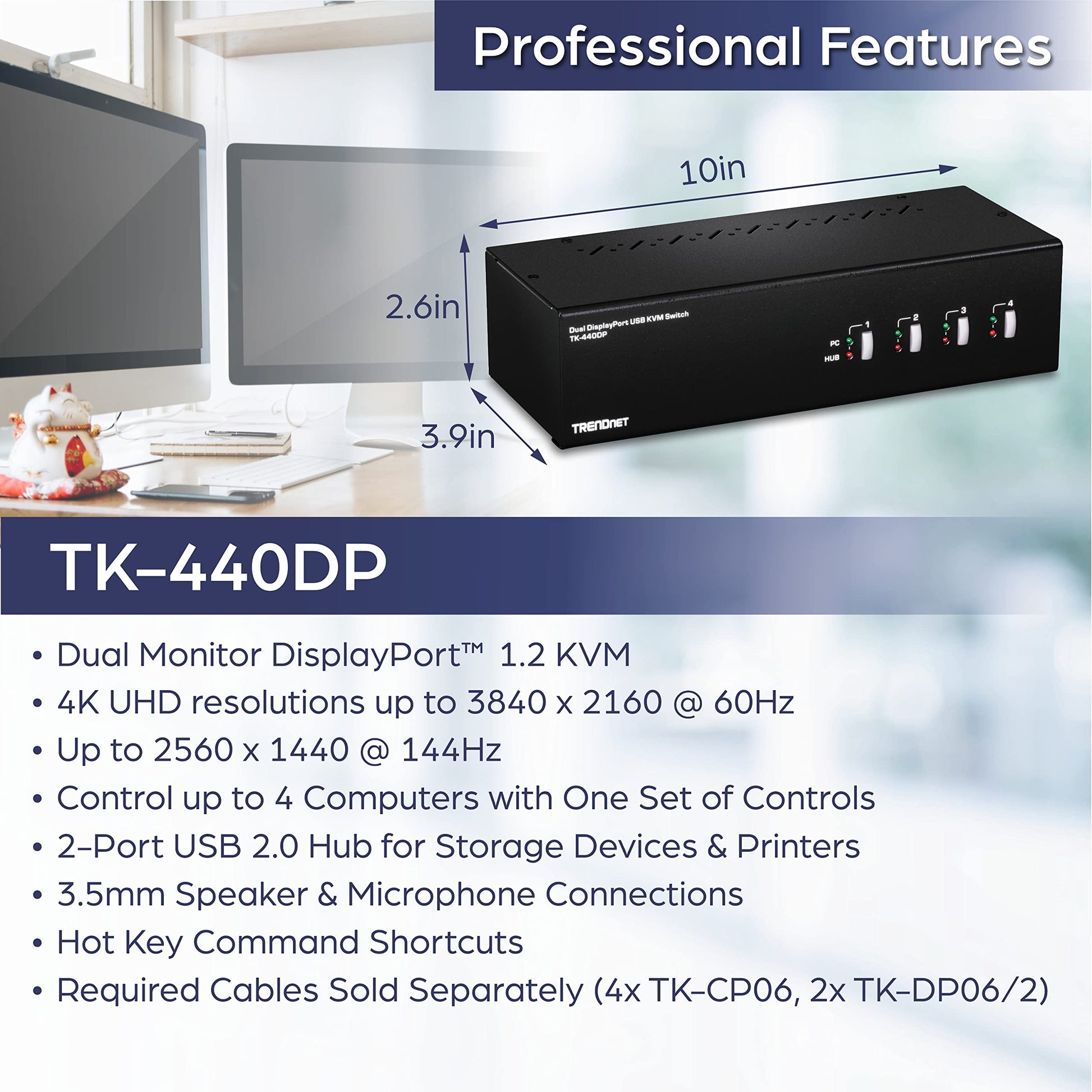 Its compact form factor, TAA compliance, and low 0.7W power consumption make it an ideal solution for data centers, control rooms, and creative studios. Supporting operational temperatures between 0 and 40°C and featuring a 100–240 VAC power adapter, it is both versatile and reliable. With a durable build and 2-year warranty, the TK-440DP provides long-term value for IT and professional environments.