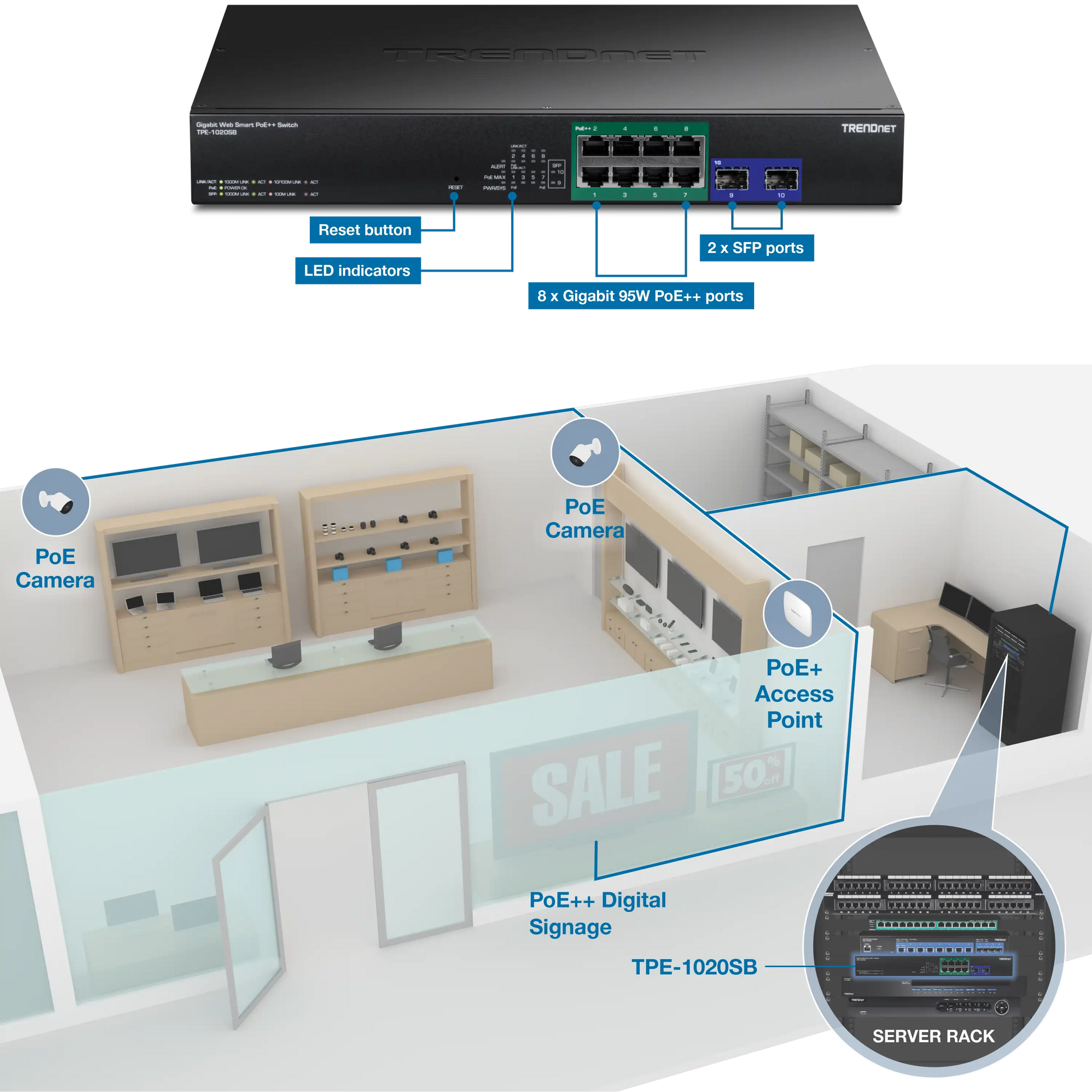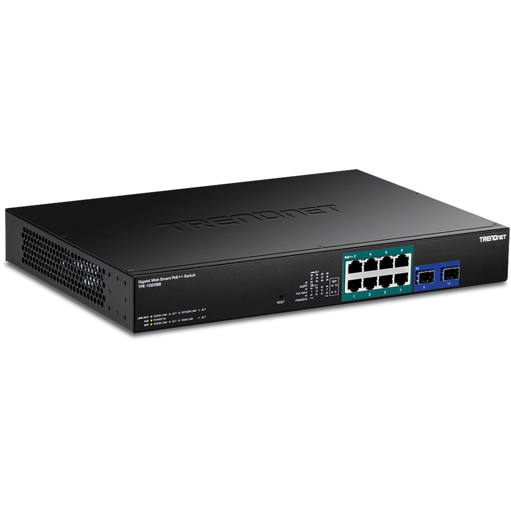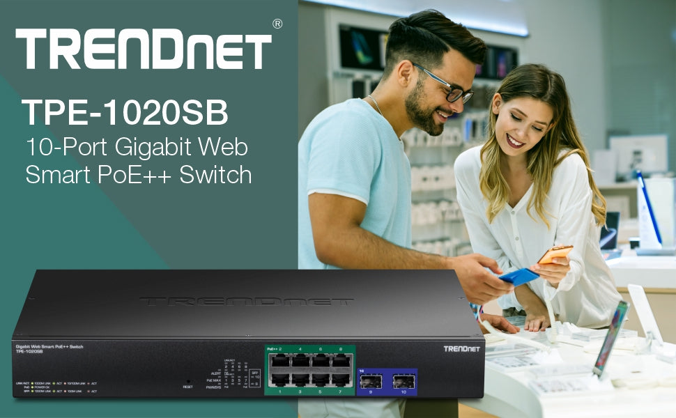 The TRENDnet TPE-1020SB is a 10-Port Gigabit Web Smart PoE++ Switch designed to deliver enterprise-class performance to small and mid-sized networks. With 8 Gigabit ports supporting IEEE 802.3bt 95W PoE++, the switch provides a total PoE power budget of 180 watts. The additional 2 SFP slots allow seamless fiber connectivity for network expansion.