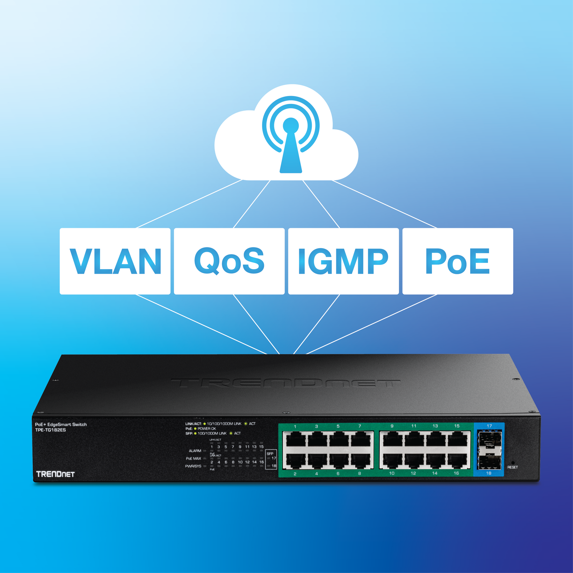 The TRENDNET TPE-TG182ES is a compact, high-performance 18-port Gigabit EdgeSmart PoE+ Switch engineered for enterprise-class networking. Featuring 16 PoE+ ports with 240W power budget, plus 2 SFP slots, it supports flexible uplink options and 2 Gbps connectivity. It delivers advanced features like bandwidth control per port, jumbo frame support up to 9KB, and complies with IEEE 802.1d for efficient traffic management.
