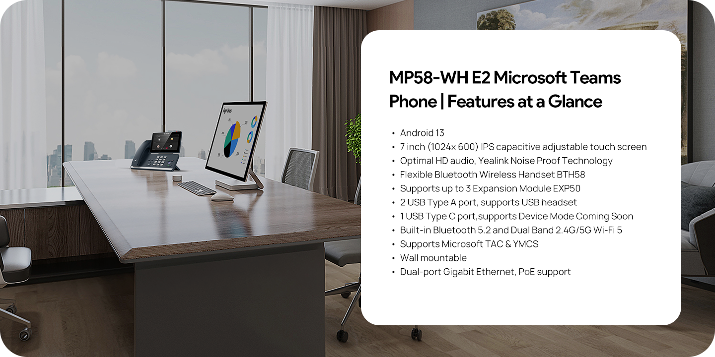 Android 13; 7 inch (1024x 600) IPS capacitive adjustable touch screen; Optimal HD audio, Yealink Noise Proof Technology; Flexible Bluetooth Wireless Handset BTH58; Supports up to 3 Expansion Module EXP50; 2 USB Type A port, supports USB headset
