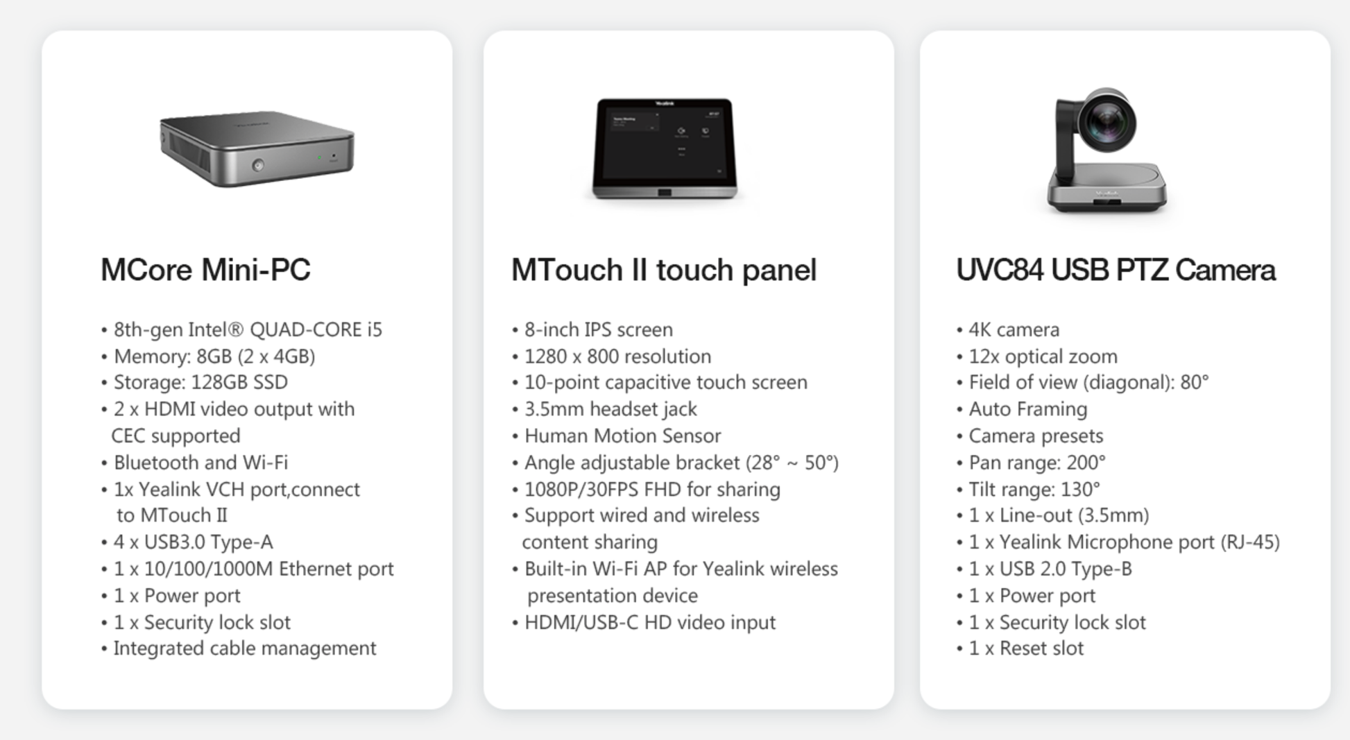 For Medium-to-large rooms, 1x UVC84 camera, VCR20 remote control, power adapter, wallmount bracket and cables, 1x MCoreKit-C5 (with MCore Pro mini-PC, MTouch Plus and RoomSensor), power adapter, cables and wall braket, Including 2-year hardware warranty