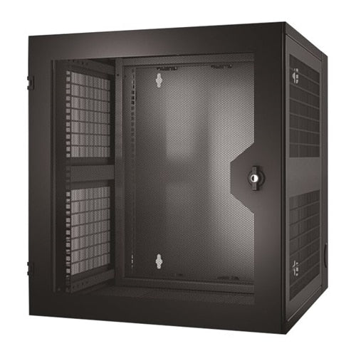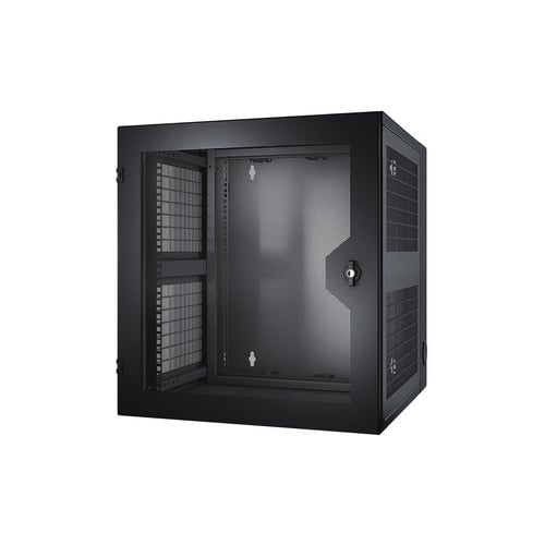The APC NetShelter WX 13U Wall-Mount Enclosure AR100HD is a purpose-built rack cabinet designed for secure and efficient edge computing deployments, especially in space-limited environments. Measuring 22.99" wide, 24.84" deep, and 26.10" high, it offers 13U of rack capacity and supports a maximum load of 200 lb. The vented front door enhances airflow, vital for maintaining system integrity.