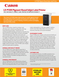 The Canon LX-P1300 is a pigment-based inkjet label printer developed for professional and regulated labeling applications. With TAA compliance and manufactured in Japan, it suits government and commercial users seeking secure procurement and consistent print durability. Although further technical details are unavailable, it is well-positioned for use in logistics, healthcare, and manufacturing due to the long-lasting, smudge-resistant qualities of pigment ink, delivering effective labeling under tough conditions.