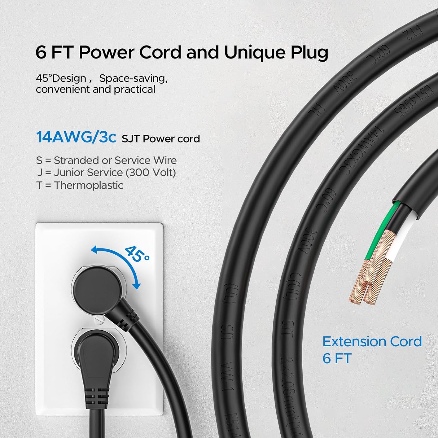 - [14AWG Cable with 45° Flat Plug for Tight Spaces]: The heavy-duty 14AWG power cord ensures reliable power delivery, while the 45-degree angled flat plug saves space, making it perfect for use behind furniture, under desks, or in narrow areas where space is limited.