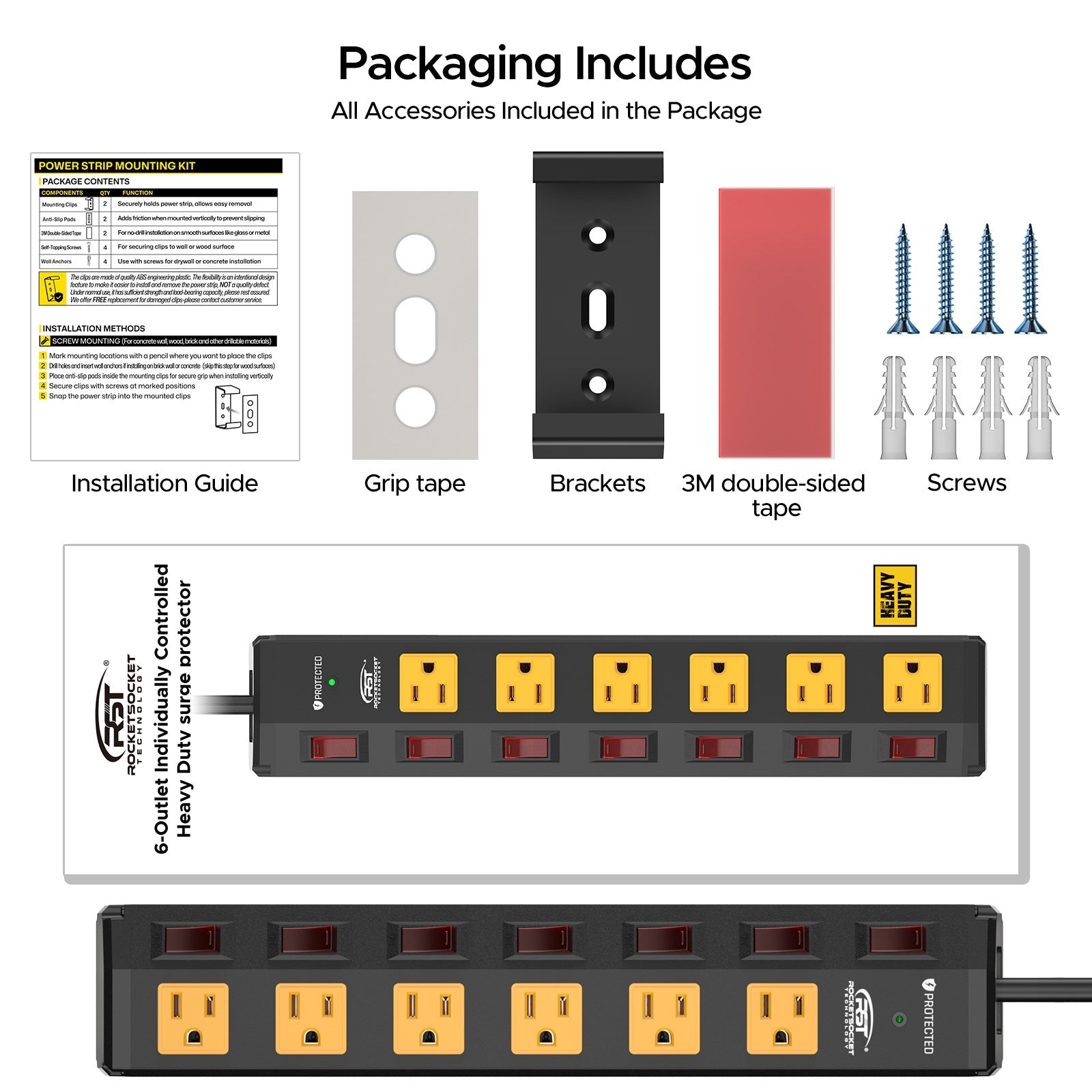 CRST 6 Outlets Individual Switches Mountable Metal Power Strip Surge Protector, 6FT Flat Plug Power Cord