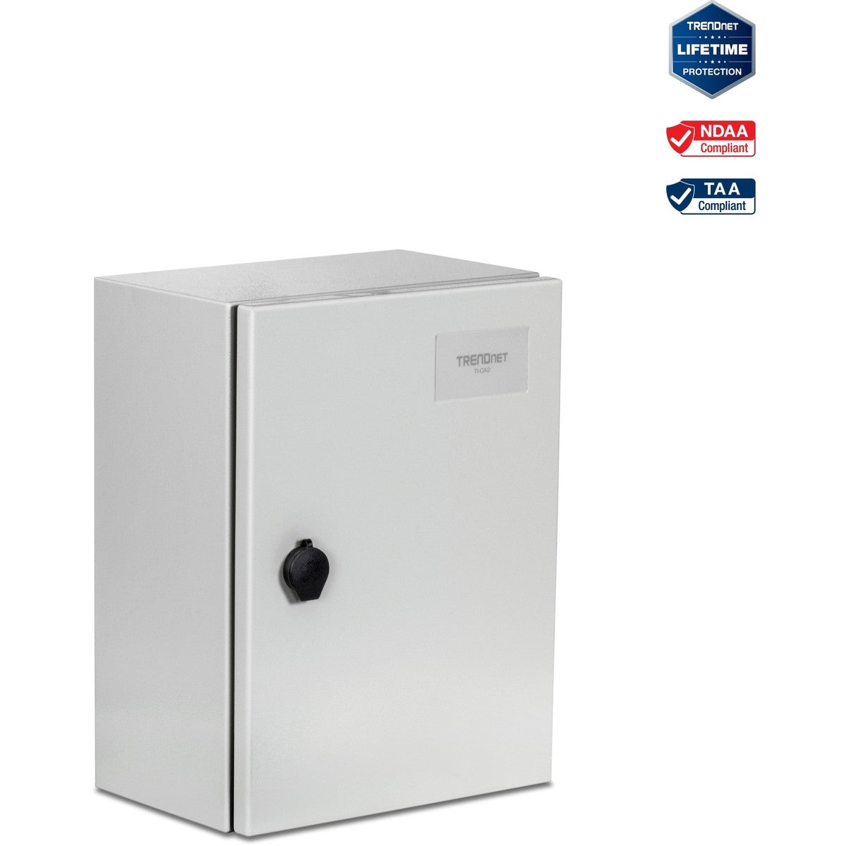 The TRENDnet Outdoor IP66 Steel Enclosure with Lockable Hinged Door, model TI-CA2, is well suited for use with TRENDnets line of industrial switches, fiber converters, and PoE injectors.