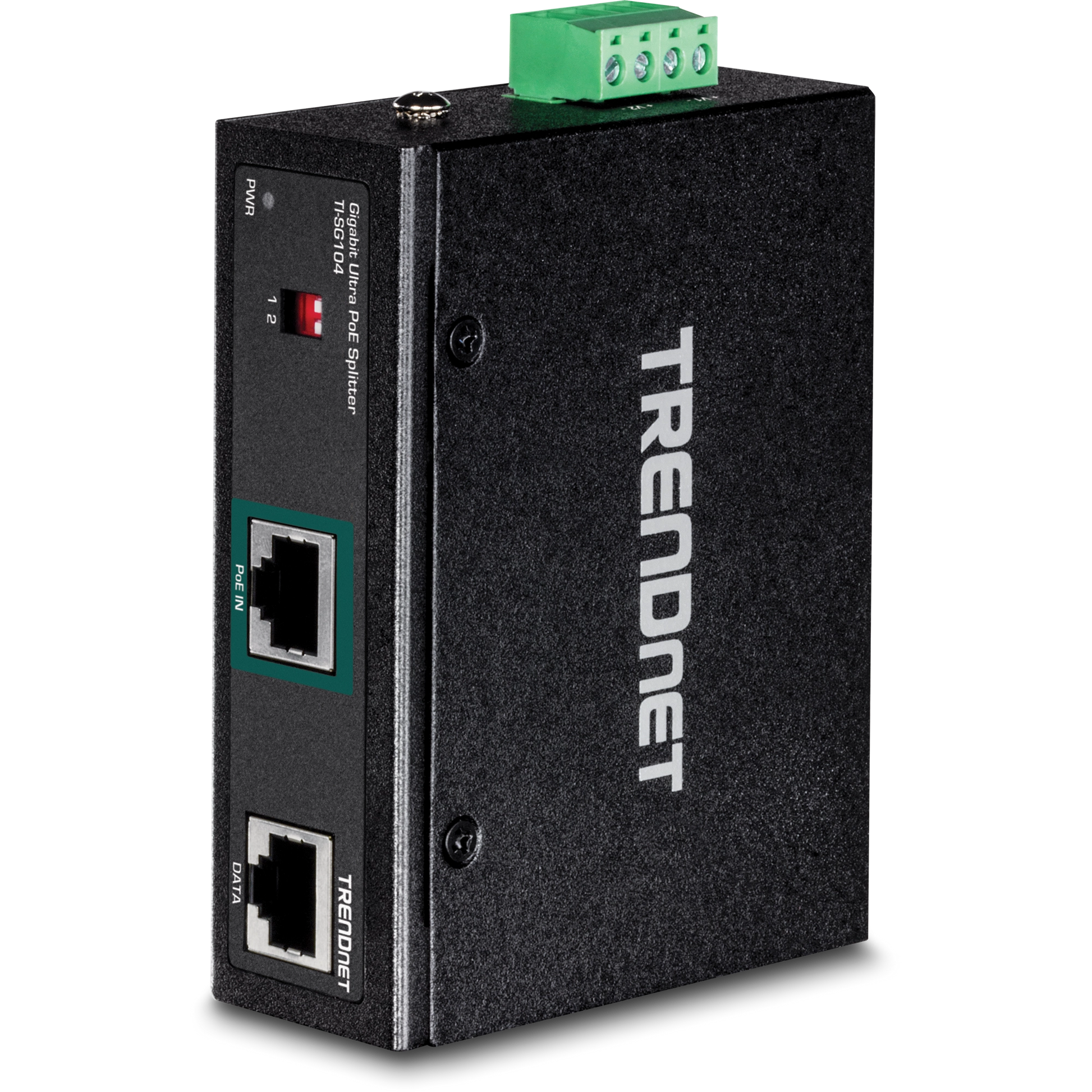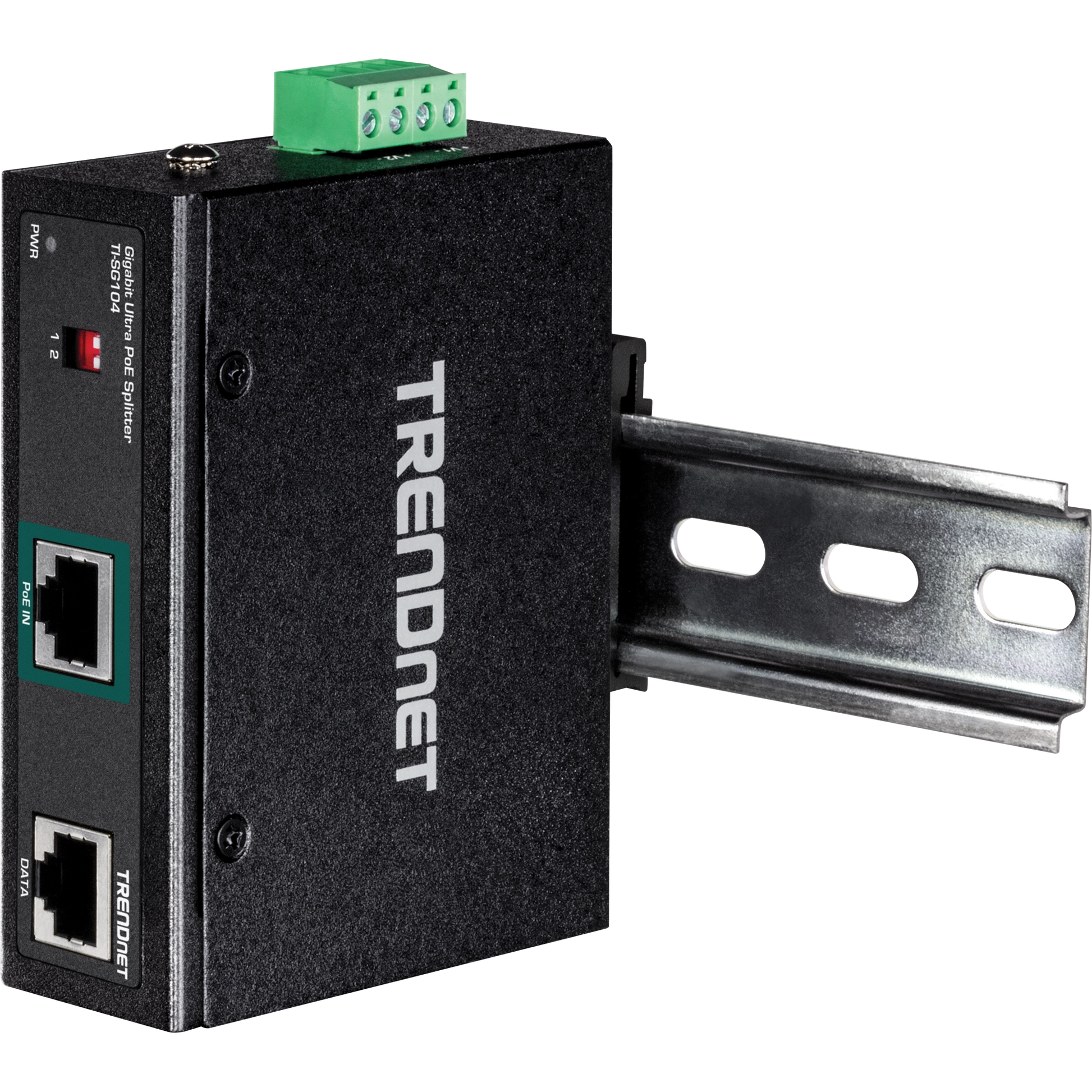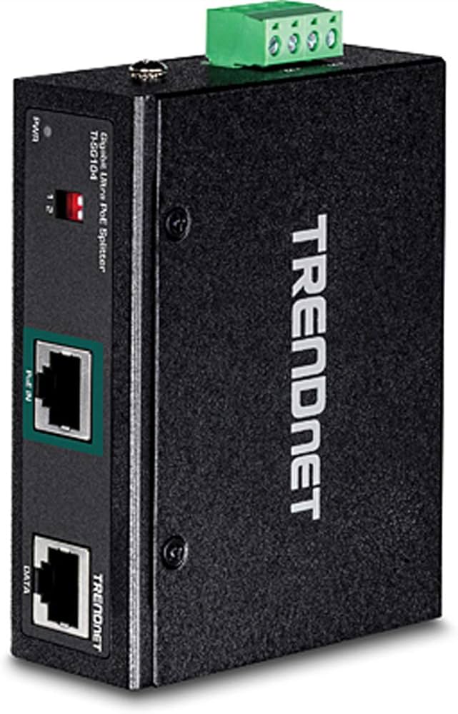 The TRENDnet TI-SG104 Industrial Gigabit Splitter delivers 1 Gbps data transfer and supports IEEE 802.3af/at/bt standards for seamless PoE integration with non-PoE devices. It includes 2 Gigabit ports (one PoE input, one data output) and is mountable via included DIN-rail or wall hardware. Manufactured in Taiwan and TAA compliant, it is backed by a 3-year warranty to ensure durability in industrial environments.