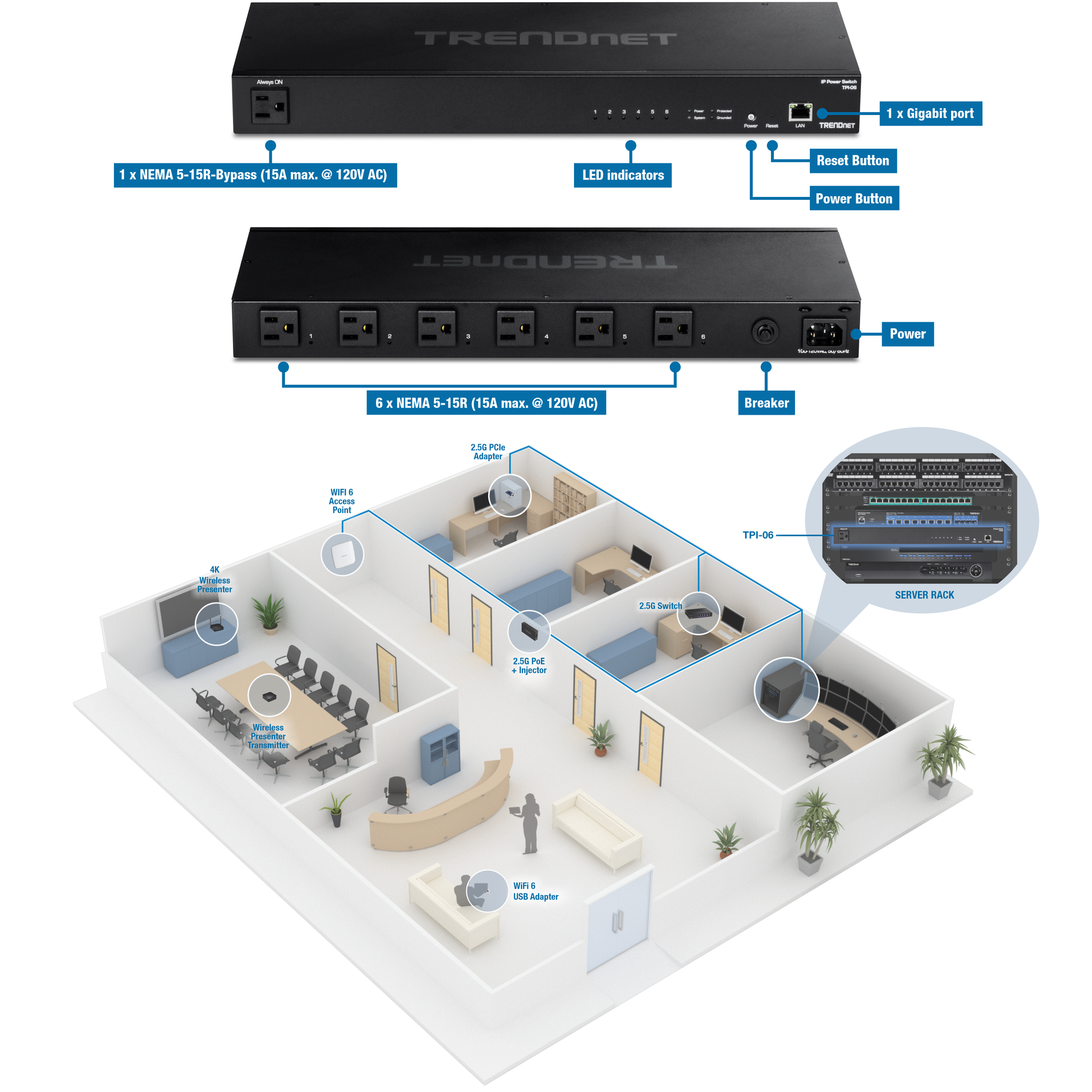 • 6 x NEMA 5-15R (15A max. @ 120V AC) outlets for managed power distribution