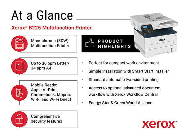 XEROX B225 MULTIFUNCTION PRINTER, PRINT/COPY/SCAN, UP TO 36 PPM, LETTER/LEGAL, USB/ETHERNET AND WIRELESS, 250-SHEET TRAY, AUTOMATIC 2-SIDED PRINTING, 110VSpecifications