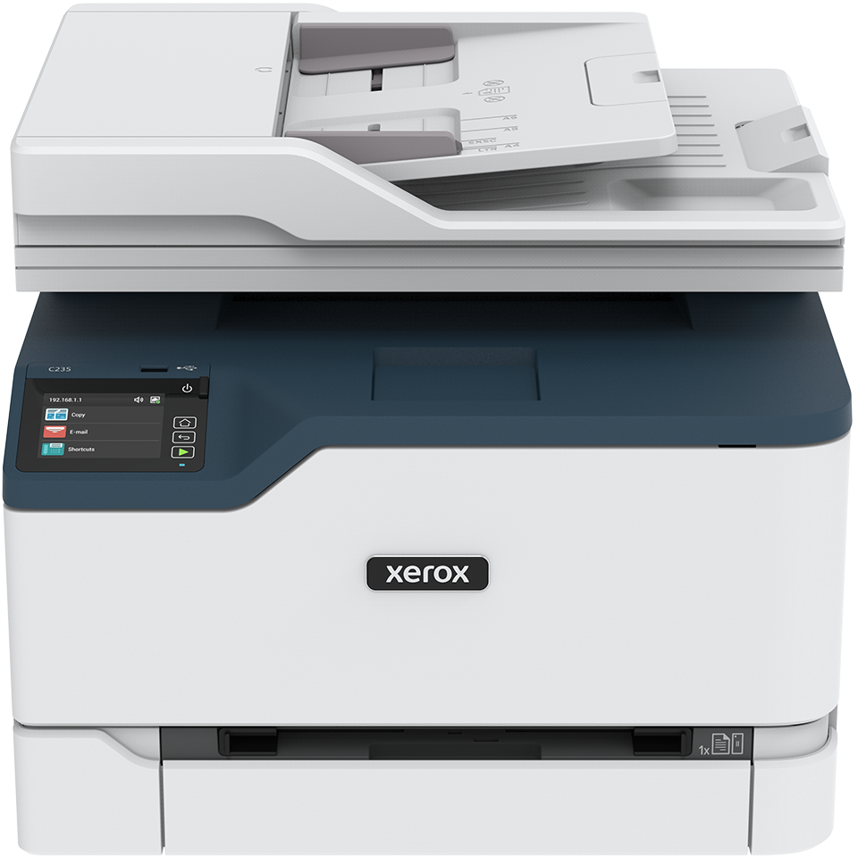 Xerox C235 - Multifunction - Color - Print, Scan, Copy, Fax - USB,USB 2.0,Ethernet 10/100Base-TX,IEEE 802.11b/g/n - Colour: up to 24 ppm; Black: up to 24 ppm - As fast as 11.1 seconds - 600 dpi x 600 dpi - Dual Core - 1GHz - Tray (Main tray): 250 sheets; Tray (Manual feed slot): 1 sheets - Flatbed Scanner - White - One-year Quick Exchange WarrantySpecifications