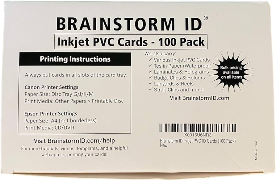 Les cartes plastiques jet d'encre Canon CR80 27 mil offrent des performances de haute qualité pour la création de cartes d'identité à la demande. Fabriquées en PVC/PET-GABS , ces cartes sont conçues pour l'impression jet d'encre recto verso , ce qui les rend idéales pour la création de badges d'identification, de cartes d'accès ou de cartes de membre couleur. Conformes aux dimensions CR80 (3,375 x 2,125 pouces) et d'une épaisseur de 27 mil , elles offrent une durabilité et une finition professionnelle avec les imprimantes jet d'encre compatibles.