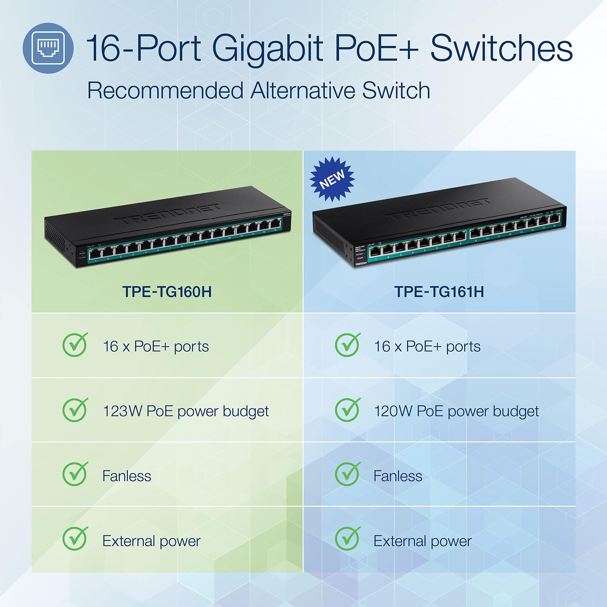 Commutateur Gigabit PoE+ 16 ports TRENDnet TPE-TG160H (123 W)