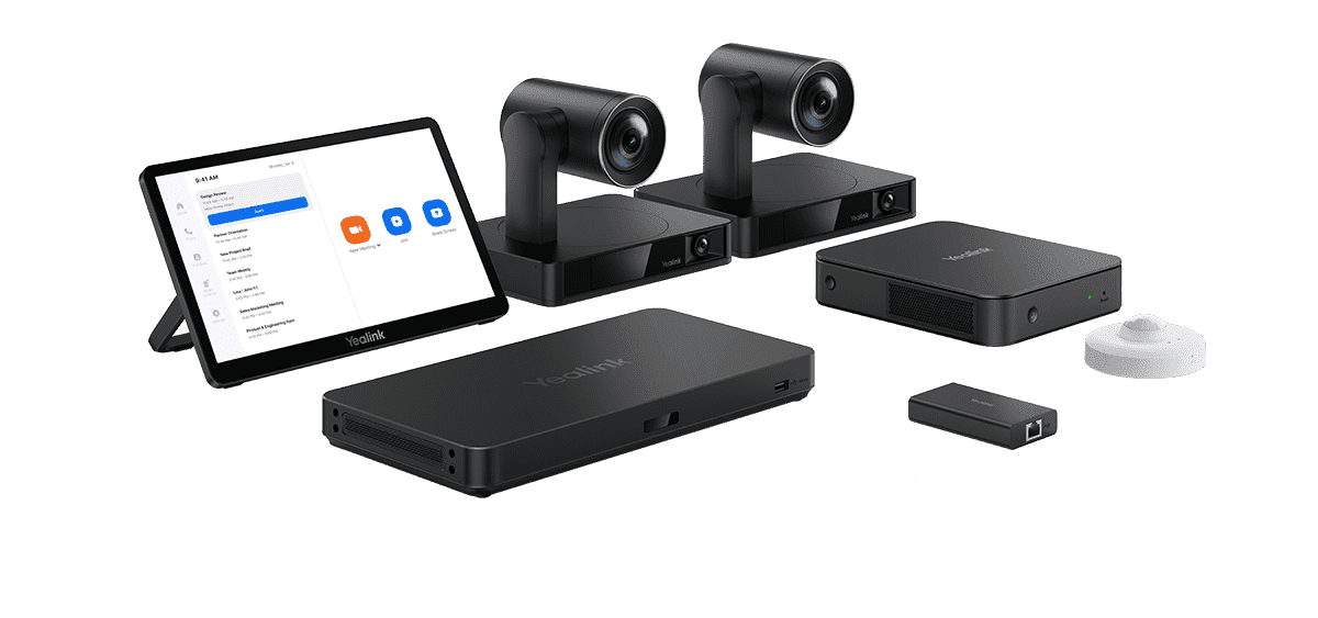 Système Zoom Rooms natif pour salles ProAV ; 2 caméras intelligentes double œil UVC86, télécommande VCR20, support de montage mural pour adaptateur secteur et câbles ; Yealink MCoreKit-C5, adaptateur secteur, câbles et support mural ; 1 AVHub ; 1 MVC-BYOD-Extender
