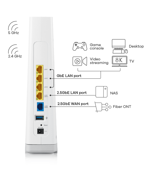 • Les ports Gigabit et 2,5 GbE combinés au WiFi 6 garantissent un débit élevé pour les applications modernes.