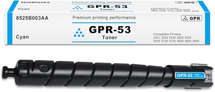 La cartouche de toner cyan Canon GPR-53 , référence 8525B003AA , est un consommable hautes performances pour les imprimantes des séries ImageRUNNER ADVANCE C3325i et C3330i . Avec un rendement de 19 000 pages , elle offre des tons cyan éclatants pour une production de documents professionnels. Fabriquée au Japon et conforme aux normes TAA , elle garantit qualité et conformité aux exigences des entreprises et des administrations publiques. Sa technologie d'impression laser garantit des rendements d'impression fiables et des résultats nets et éclatants pour divers travaux d'impression à volume élevé.