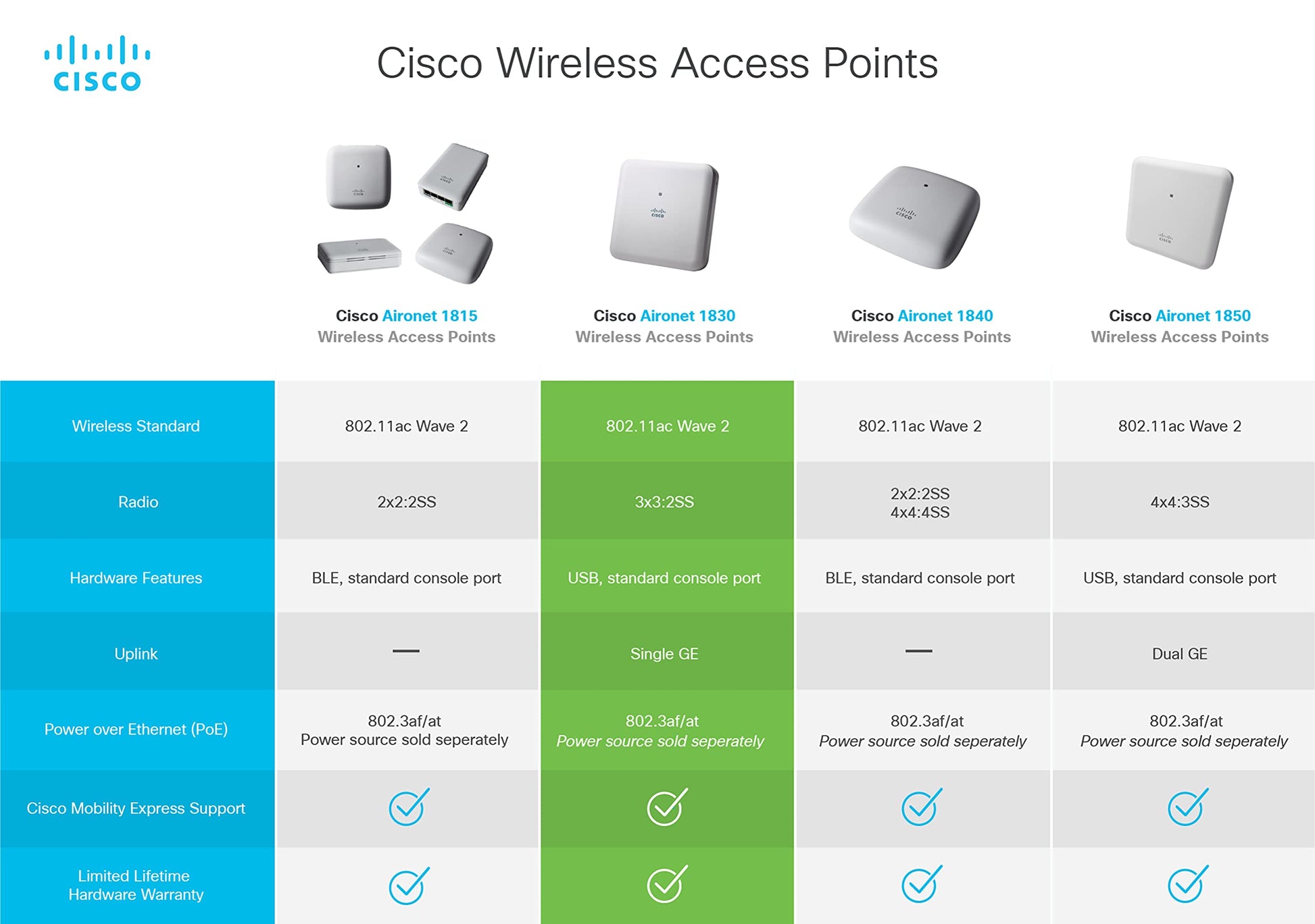 | Cloud Management Support | Cisco Mobility Express or Cisco Wireless LAN Controller |