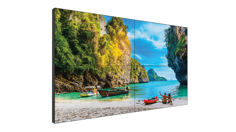 Écran LCD pour mur vidéo 55 pouces, 1920 x 1080, 700 nits, largeur cadre à cadre de 0,88 mm. Fonctionnement 24h/24 et 7j/7, paysage et portrait, emplacement OPS. Alimentation et électronique internes. Traitement intégré du mur vidéo jusqu'à 10 x 10. Contrôle IR, RS-232 et LAN.Caractéristiques