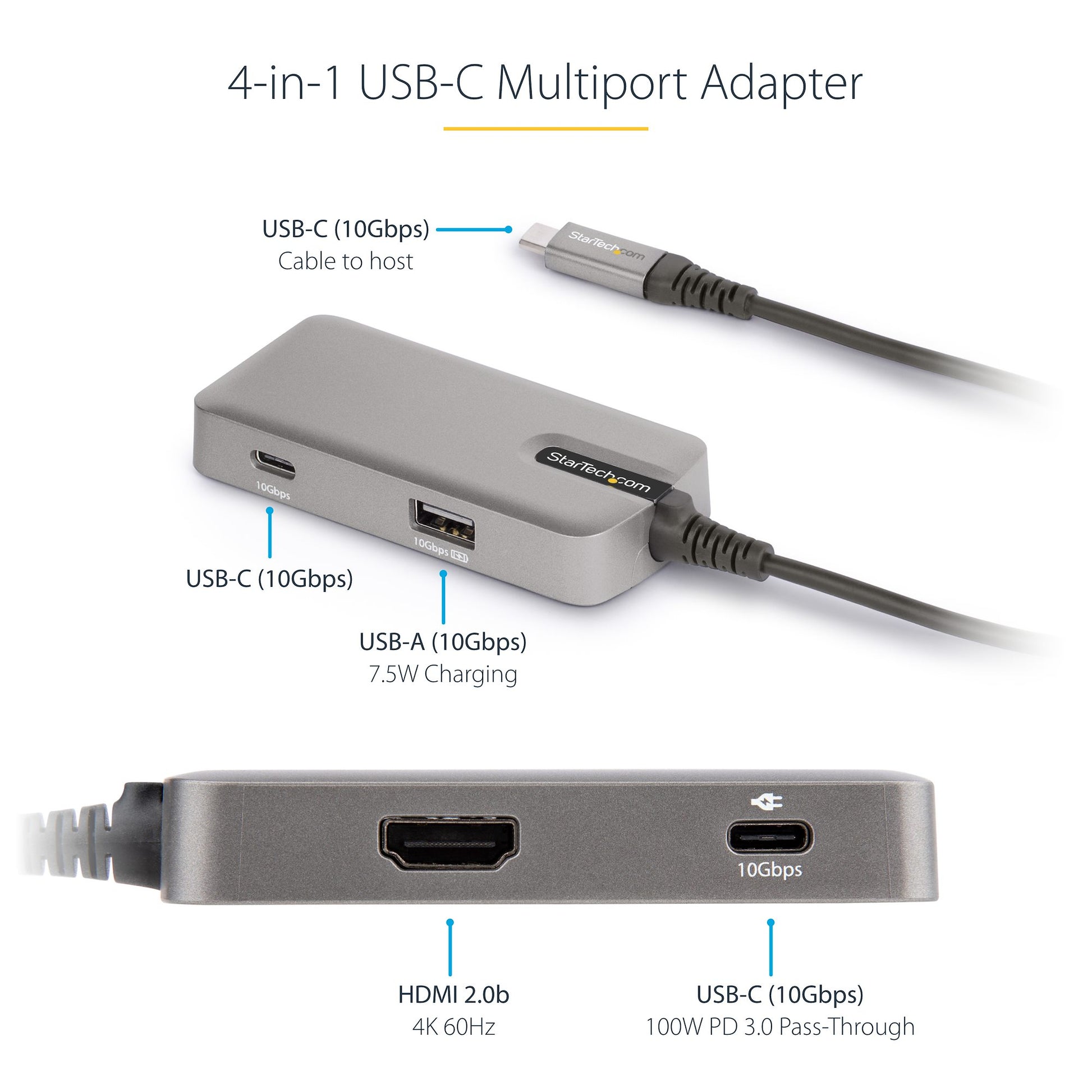 Adaptateur multiport USB C vers HDMI 2.0b HDR10 4K 60 Hz avec DP 1.4 Alt-Mode - 1x USB-A 10 Gbit/s avec BC 1.2 (7,5 W) 2x USB C avec 1x données partagées et 100 W PD Passthrough - Câble 10 pouces - Adaptateur d'alimentation Mini Dock de voyage Type-C ou alimenté par bus - Win/Mac/Chrome/iPad/Android