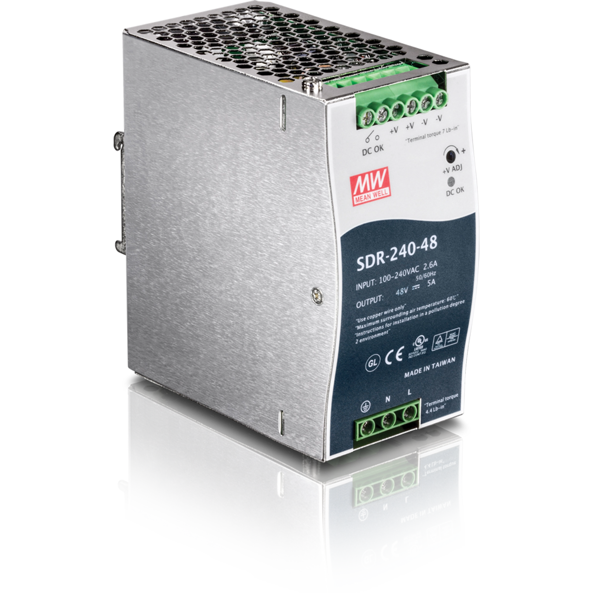 Alimentation - 100-240 V CA, 50/60 Hz, 1,8 A 125-370 V CC - Puissance fournie (W) : 240 - Alimentation industrielle avec montage sur rail DIN intégré ; PFC actif intégré (PF 0,93) - Garantie 1 anCaractéristiques