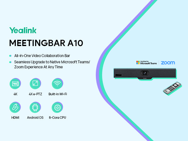 | Included Components | A10 Collaboration Bar, Power Adapter, Wall Mount Bracket, Cables, VCR11 Remote Control |