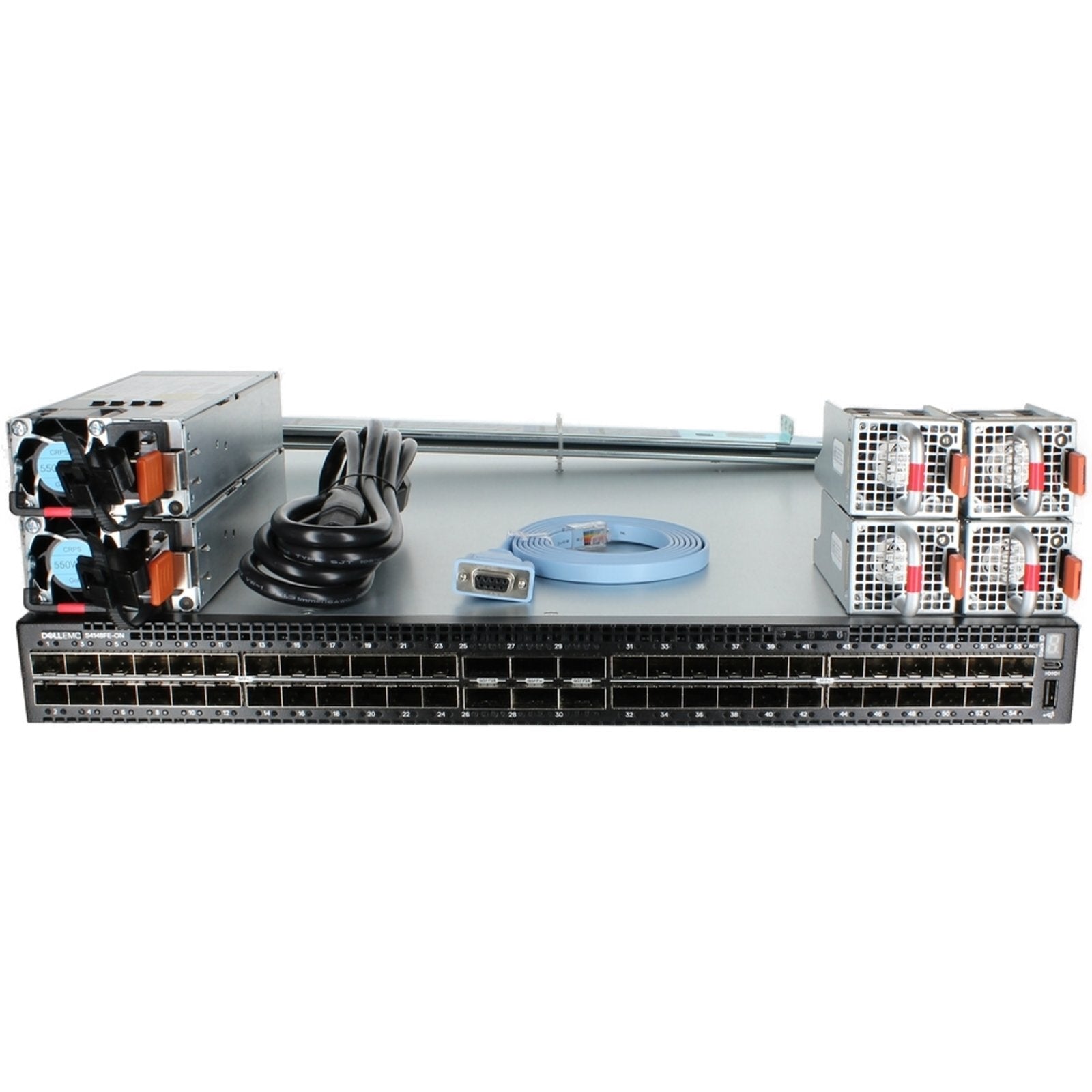 Powered by a 2.2GHz CPU with 16GB RAM, 64GB SSD storage, and 8GB flash memory, it delivers fast configuration and processing. The device supports redundancy through dual power supplies and fans, a 32MB packet buffer, and a 550W power draw with 100–240VAC input. It operates within a 0°C to 40°C temperature range and is TAA-compliant and RoHS-certified.